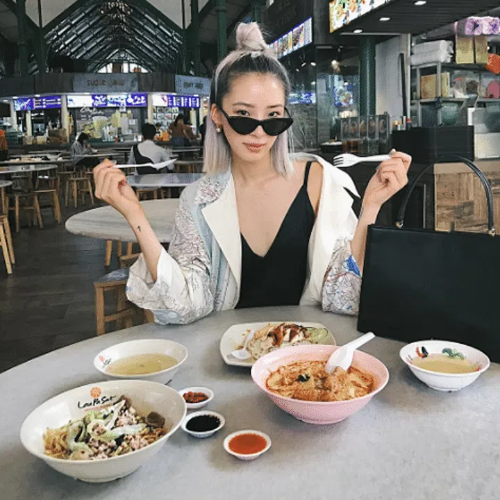 Model Irene dressing up for lunch at the Lau Pa Sat is the equivalent of a crash course on how to look chic when dining at hawker centres.