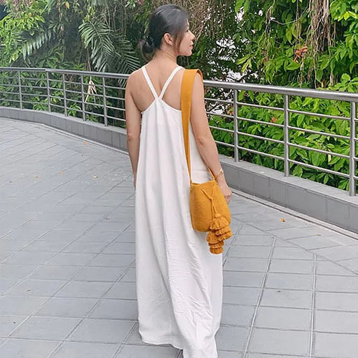 Belinda demonstrates how to do a #summervibes ensemble without looking too try-hard. This white maxi cotton dress with yellow crochet bag combo is effortless and easy – perfect for our sweltering weather.