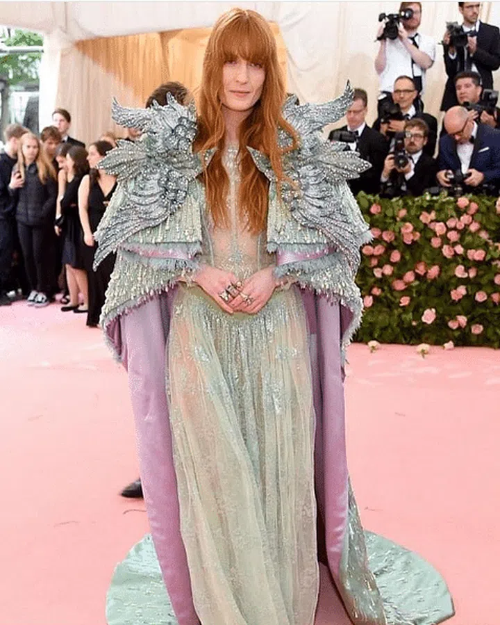 English singer Florence (+ The Machine) looked like a majestic goddess on the red carpet in this turquoise and lilac medieval-inspired Gucci gown. We especially loved the oversized, statement-making beaded cape with strong shoulders that made her look like a warrior elf princess character. In fact, she wouldn’t look out of place in any Lord of the Rings movies. Florence wisely paired her embellished, complicated outfit with pared down makeup — another reason why we’re loving this look.