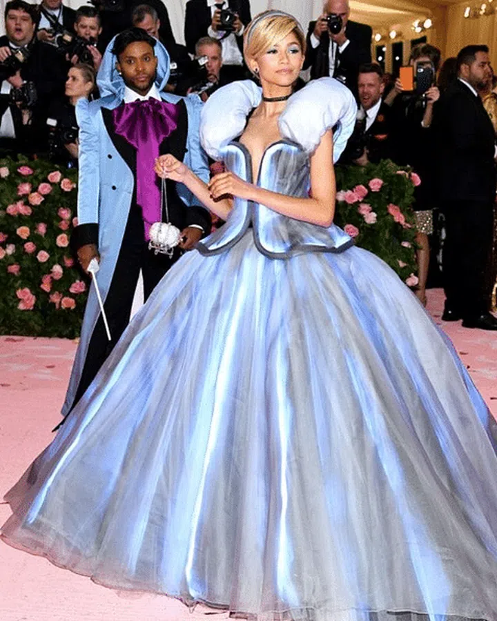 Disneyland called and they’re reporting a missing Cinderella. Zendaya was initially wearing a grey-toned gown, until her stylist Law Roach waved a smoky wand on the red carpet and transformed her dress into a fluorescent powder blue gown similar to the one worn by the Disney princess. According to her stylist, the dress, which is by Tommy Hilfiger, mirrors a real-life transformation for the actress’ career. The former Disney Channel star is set to helm gritty HBO drama Euphoria. Zendaya finished her look with a small carriage-shaped ball clutch and even left her glass slipper behind on the staircase leading to the museum. However, we think the outfit is reminiscent of Claire Danes’ 2016 Met Gala showing, when she wore a whimsical glow-in-the-dark Zac Posen dress.