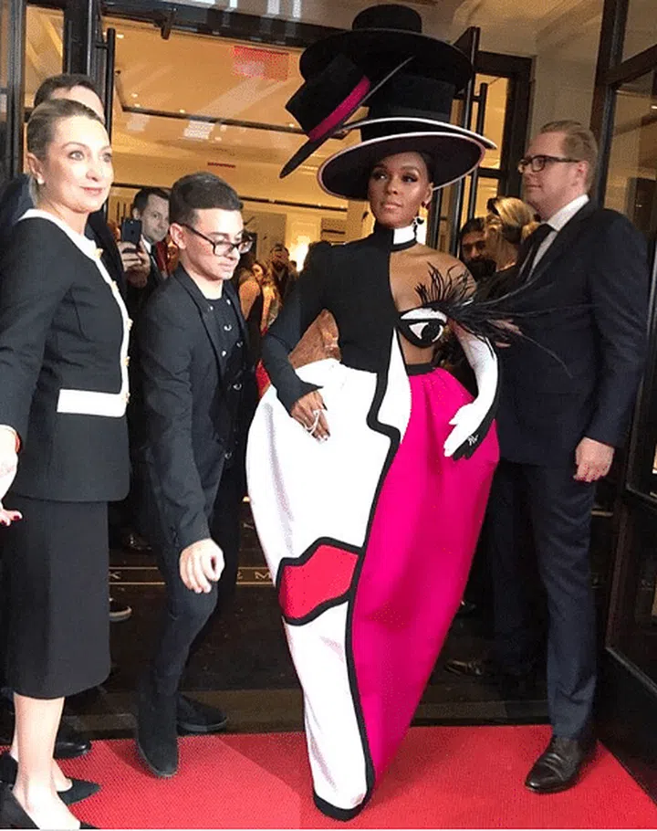 Janelle Monáe has an eye for fashion, can you tell? Dressed in a museum-worthy artistic creation by Christian Siriano, this sculptural piece features an eye strategically placed over her left breast and it, erm, reportedly blinks too. The dress drew inspiration from the surreal art of Salvador Dali and Pablo Picasso, artists whom Janelle is personally a fan of. Crowning her campy look is a gravity-defying headpiece that features multiple hats stacked atop one another. We love.