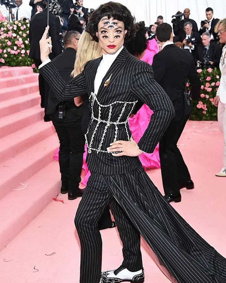 All eyes were literally on Ezra Miller for his head-turning look. The actor is known for his adventurous sartorial choices and boy was his offering at this year’s Met creepy yet enthralling. Stepping out in a pinstripe Burberry suit and pearl corset, the pièce de résistance was the optical illusion makeup that was painted across his face (we counted seven eyes, including his own). It gives us a headache but we can’t look away. We really can’t.