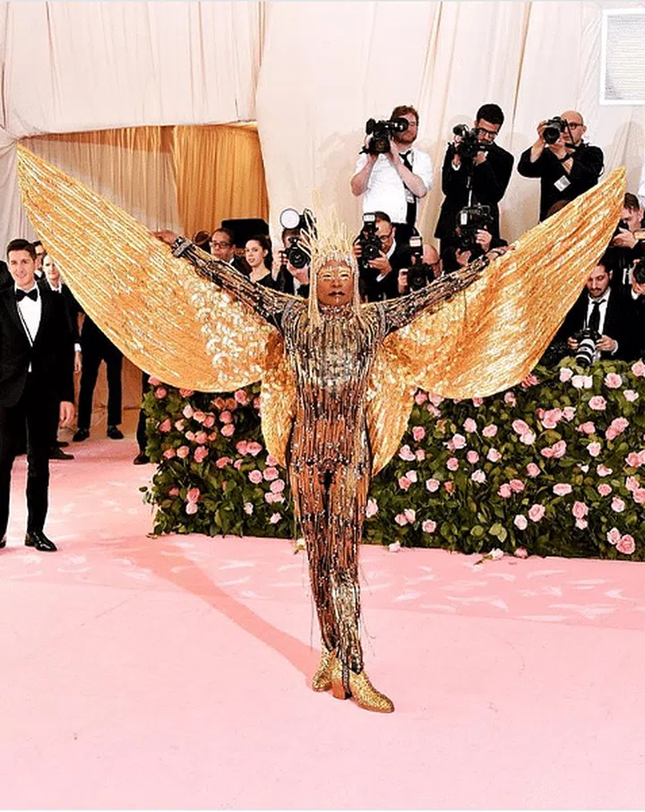 Billy Porter isn’t afraid to take risks when it comes to fashion (remember his Oscars red carpet Christian Siriano dress?). His fearlessness was clear when he appeared on the Met Gala red carpet in this epic glittery gold outfit from The Blonds, which he described as showing “Old Testament Realness”. The bejewelled cat suit came complete with a 24-carat gold headpiece, wings and custom gold-leaf Giuseppe Zanotti shoes. Extra points to him for his memorable entrance — he appeared on an ancient Egyptian litter, borne by six shirtless men who were also in gold. So deliciously flashy, we might want to hail him as the new Pharaoh of Phashion.