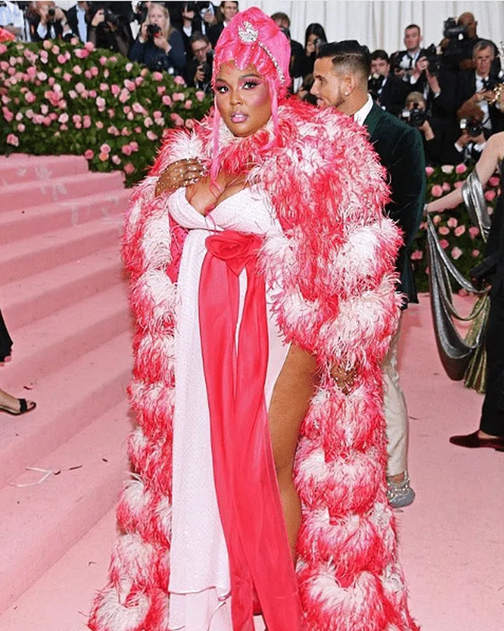 Going monochromatic is a relatively safe choice, especially for a theme that celebrates excessiveness and drama. But American hip hop singer and rapper Lizzo showed that it’s perfectly possible to be over-the-top when you go in a coordinated feathered and frilly hot pink creation from Marc Jacobs, complete with matching neon hair colour and makeup. The bold high slit also showed off the singer’s limb.