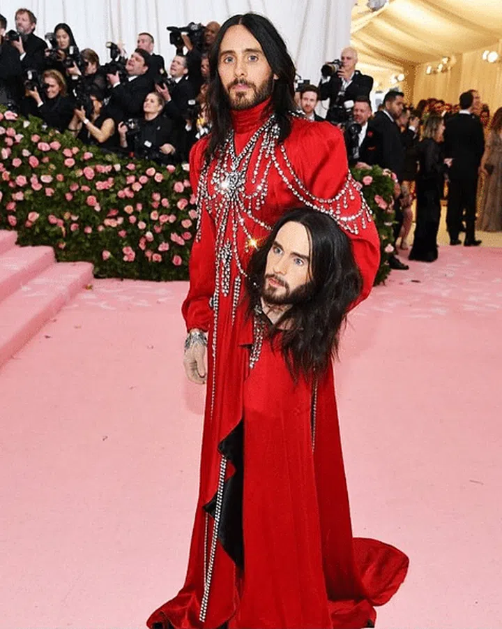 Did a double take, didn’t you? Decked out in an opulent long sleeve red Gucci gown that’s encrusted with crystals, the irreverent fashion maven Jared Leto walked the red carpet while carrying his own severed “head” like a macabre purse. He was paying homage to Gucci’s F/W’18 runway show where models carried life-size replicas of their own heads. Talk about being a “head” above the rest.