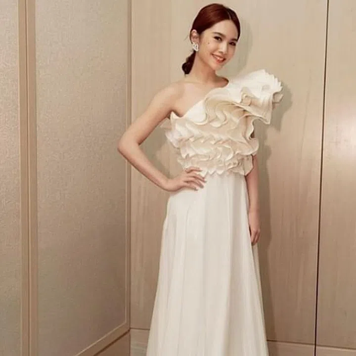 The exquisitely arranged ruffles flattered Taiwanese singer Rainie’s figure perfectly and showed a new grown-up side to the “Lessons in Love” singer. The singer was seen wearing this cascading ruffled number from Syrian label Ashi Studio at the 58th Asia Pacific Film Festival held in Taipei.