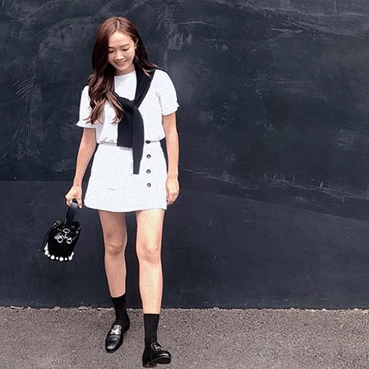 There is nothing classier – or easier – than styling an outfit that’s purely black and white. Both bold and classic, a black-and-white ensemble is understated enough to work for any event on your calendar. South Korean singer Jessica Jung’s black knitted sweater (worn around her neck) elevates her white tee and skirt outfits and adds a pretty texture.