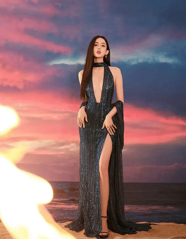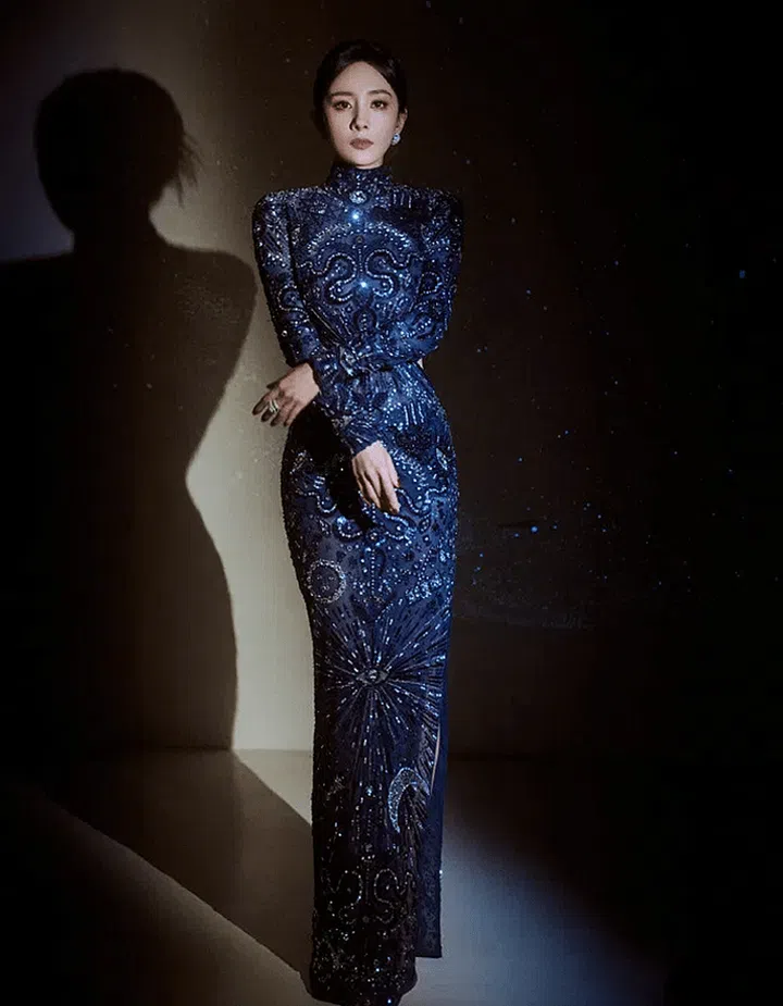 Yang Mi dazzled in a blue cut-out qipao from Zuhair Murad's 2022 Autumn/Winter haute couture collection, adorned with diamonds for an elegant and mysterious vibe. The clever cut-outs highlighted her alluring curves.