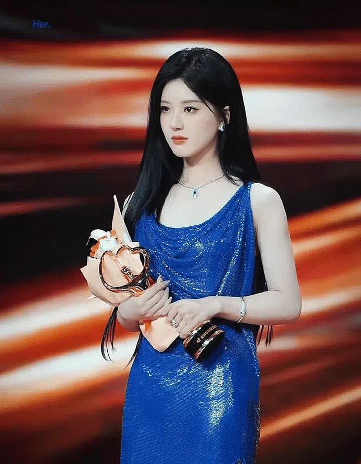 Zhao Lusi's second ensemble, specially tailored by Atelier Versace, drew inspiration from the 2024 Spring/Summer collection. The pleated neckline echoed the high side-slit detail, while the classic blue metallic mesh fabric added a touch of elegance.