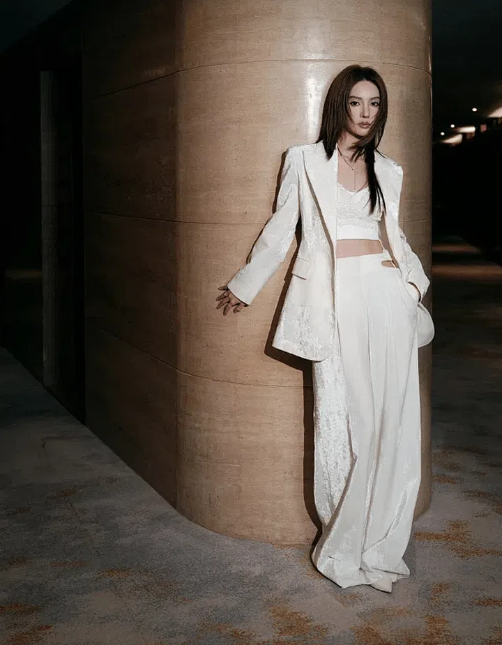 Jin Chen turned heads in an Ermanno Scervino white satin and gold thread suit from the 2023 collection. Paired with a lace camisole, her ensemble was effortlessly chic, standing out amid the array of dresses.