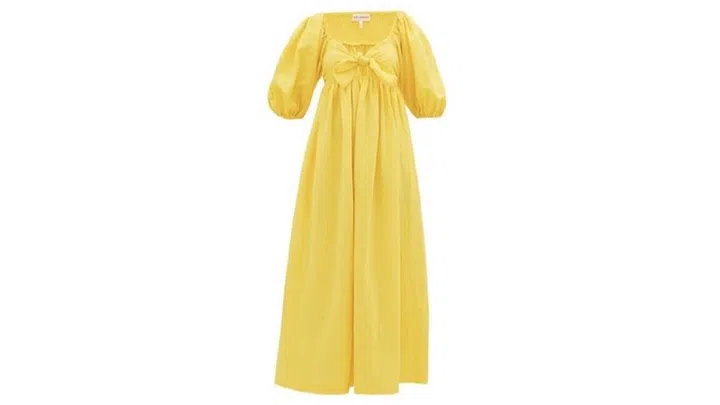 Rendered in vibrant lemon yellow that’s bright enough to lift spirits, this dress features an empire waistline, a knotted sweetheart neckline and puffy sleeves for a romantic, modern reiteration of classic Victorian silhouettes.