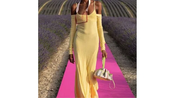 From Jacquemus’s S/S ‘20 runway show, this gorgeous yellow knitted dress hugs the body like a glove. Designed with an off-the-shoulder neckline and a soft ribbed knit bra in a matching shade of yellow worn over the top of the dress, this hip-hugging dress flares out to a flowy, flared skirt with pleated panels.