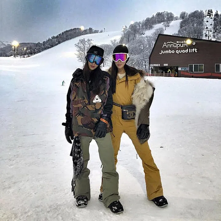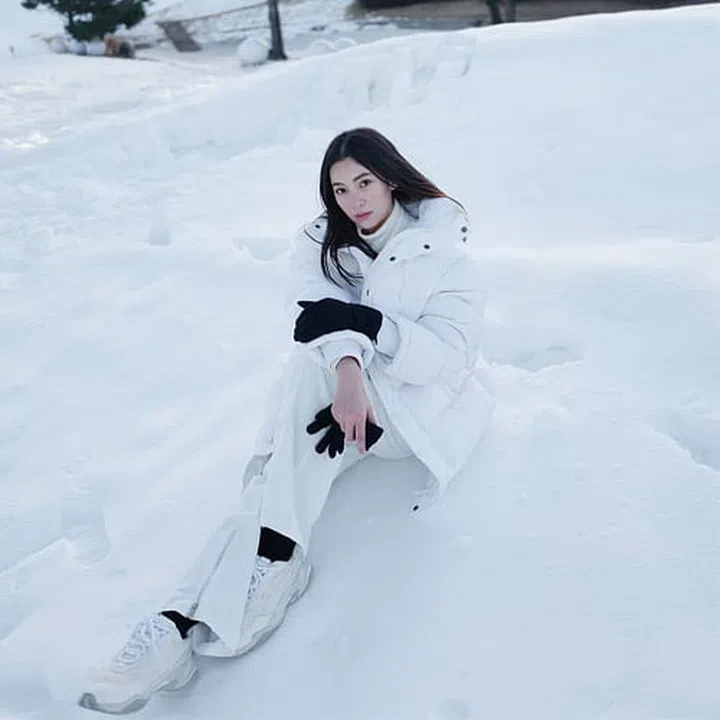Looking ethereal in an all-white ensemble, Thai actress Bella Campen added black accessories (socks, gloves and belt) to contrast to her ski ensemble.