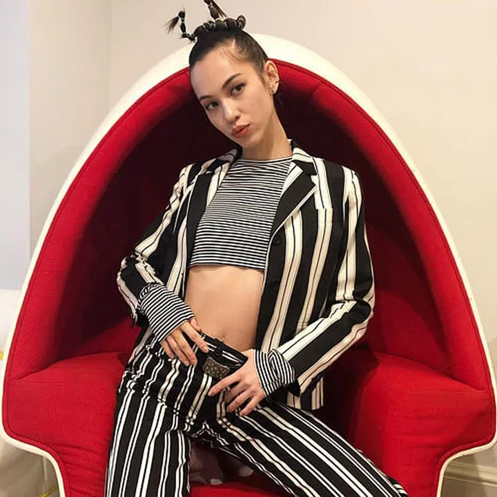 Using only black and white striped outfits, her long-sleeved crop top, blazer jacket and trousers are all of various stripe thickness and the juxtaposition of the horizontal and vertical patterns add visual interest.