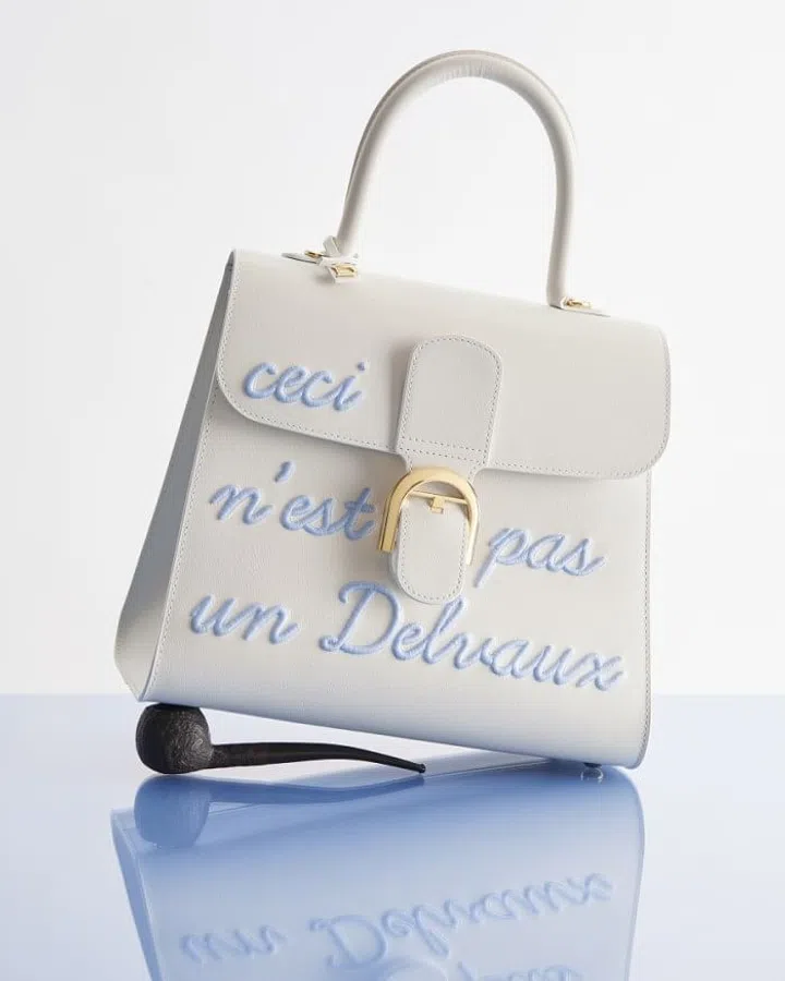 L'Humour (which means hunour) was inspired by the iconic painting 'Trahison des images' (1928-1929). This hyperreal depiction of a pipe, with the famous quote "Ceci n'est pas une pipe" (This is not a pipe), adds a playful touch to the collection. Delvaux introduces a fresh interpretation of the Brillant silhouette, adorned with scripted embroidery of "Ceci n’est pas un Delvaux" (This is not a Delvaux) on box calf leather.