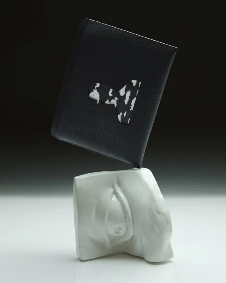 Drawing inspiration from the painting 'L’Art de la Conversation' (1950), you'll find two graceful swans intertwined together on one side and with the word "Amour" (0r love) on the other. This poetic depiction reflects Magritte's passion with Georgette, whom he met as a teenager. Despite being separated by war, they remained inseparable until Magritte's passing in 1967. The L'Amour motif can be found embroidered on the Brillant and Pin ranges, and is available in calf leather in refreshing shades of aloe, ivory, azure, and bloom.