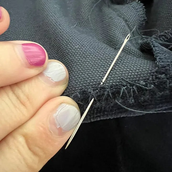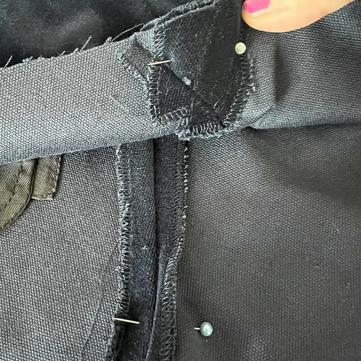 Step 3: Use pins to stabilise the newfound silhouette. For my pair, I didn’t have to fold over the curved seam of where the crotch used to be as I cut it really short.