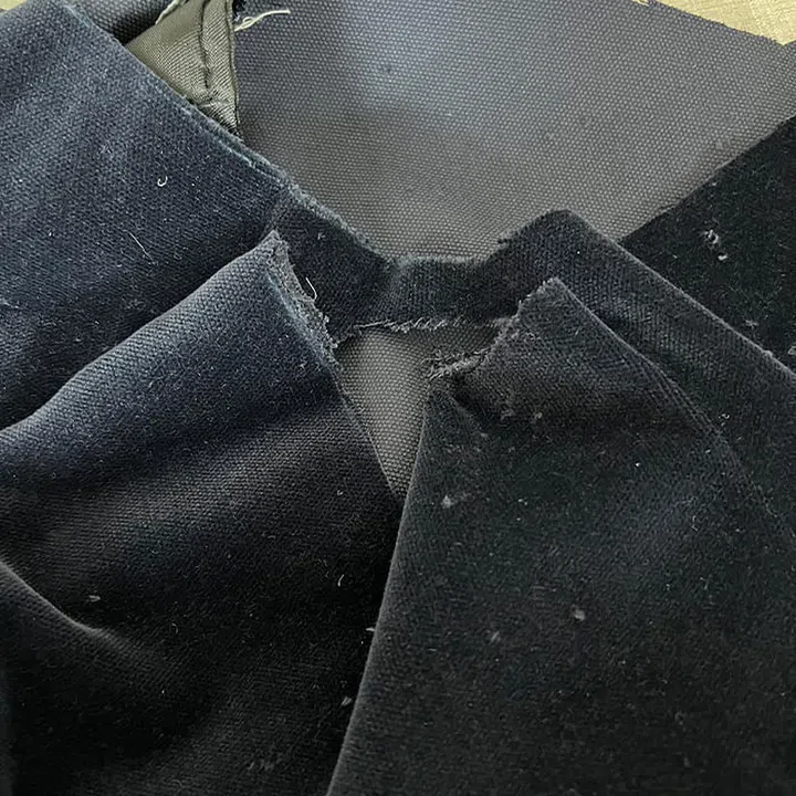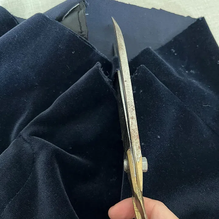 Step 2: Your pants will have a remnant of the crotch fabric after you cut. Snip the area in half.