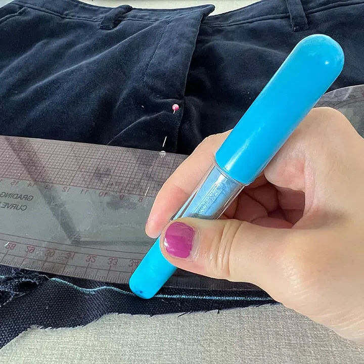 Step 1: Get a pair of trousers one size bigger than your normal size for an instant low rise fit. Set your mark on how short you want your skirt on the trouser legs with a tailor’s chalk. Pull out your pockets before you cut so that the scissors doesn’t get into the pockets!