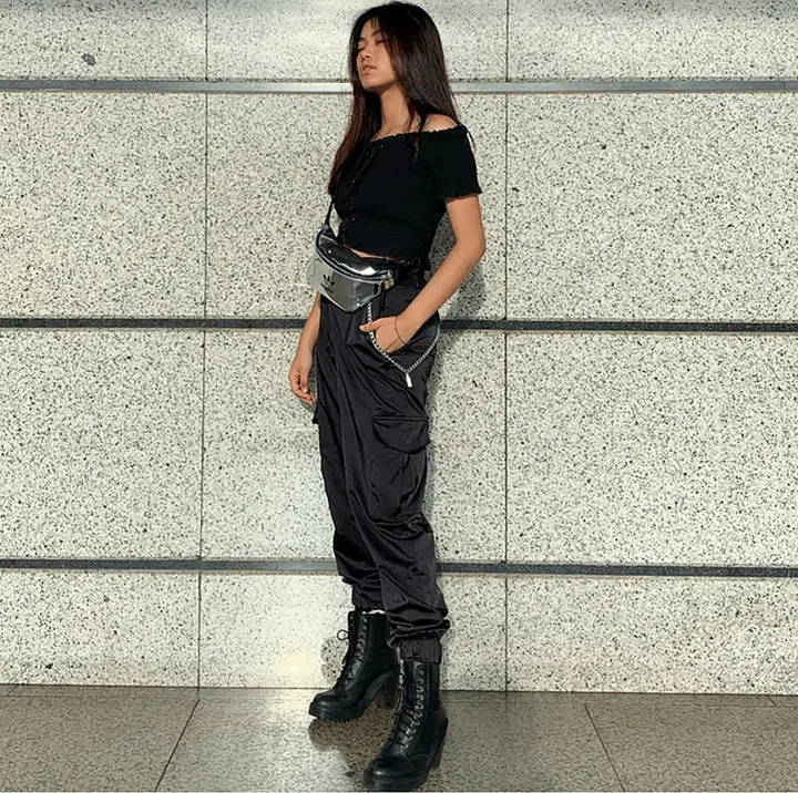 You can never go wrong with an all-black ensemble. Pimp it up with silver accessories like this reflective fanny pack.
