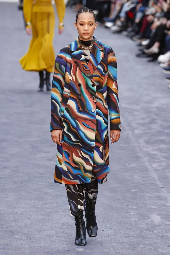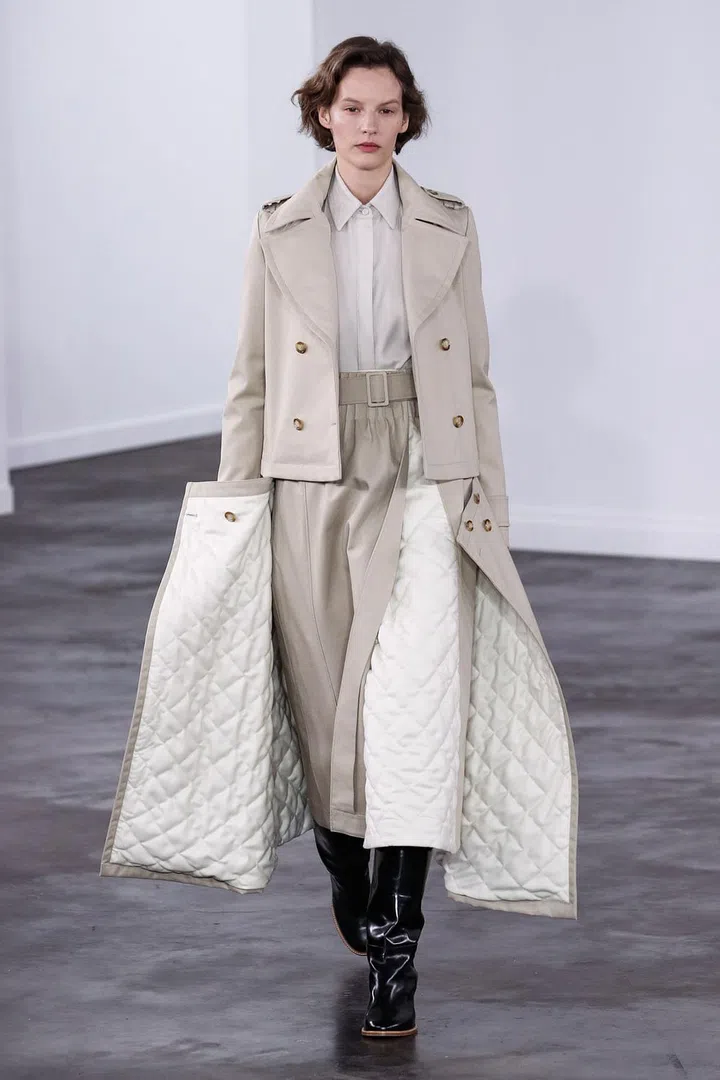 Gabriela Hearst (here), and her military-influenced coats with gold buttons that are cut sharply across the middle to reveal a mattress-topper-esque inner lining; Tibi, and its sleek tri-coloured (that’s black, white and brown) duster coat that looks lightweight enough for rainy days.