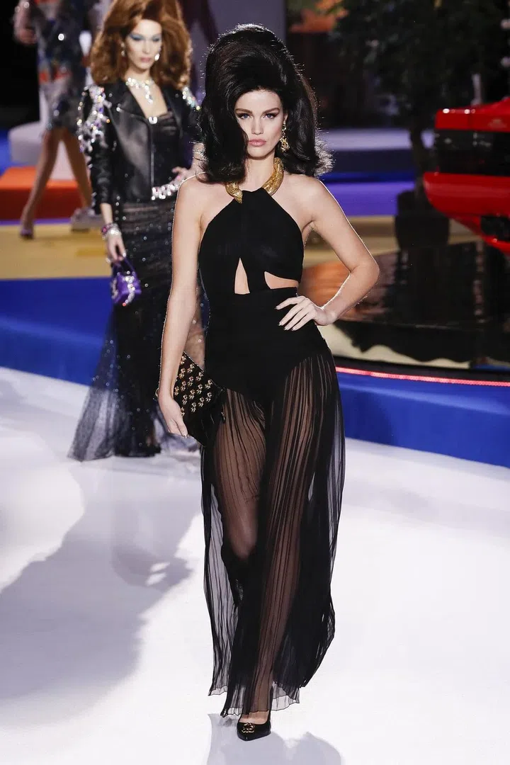 From Missoni’s glittered broad collar and Marni’s satin tunic complete with gold jewellery to Moschino’s halter dress (pictured here), designers paid homage to Ancient Egypt through subtle details and silhouettes.