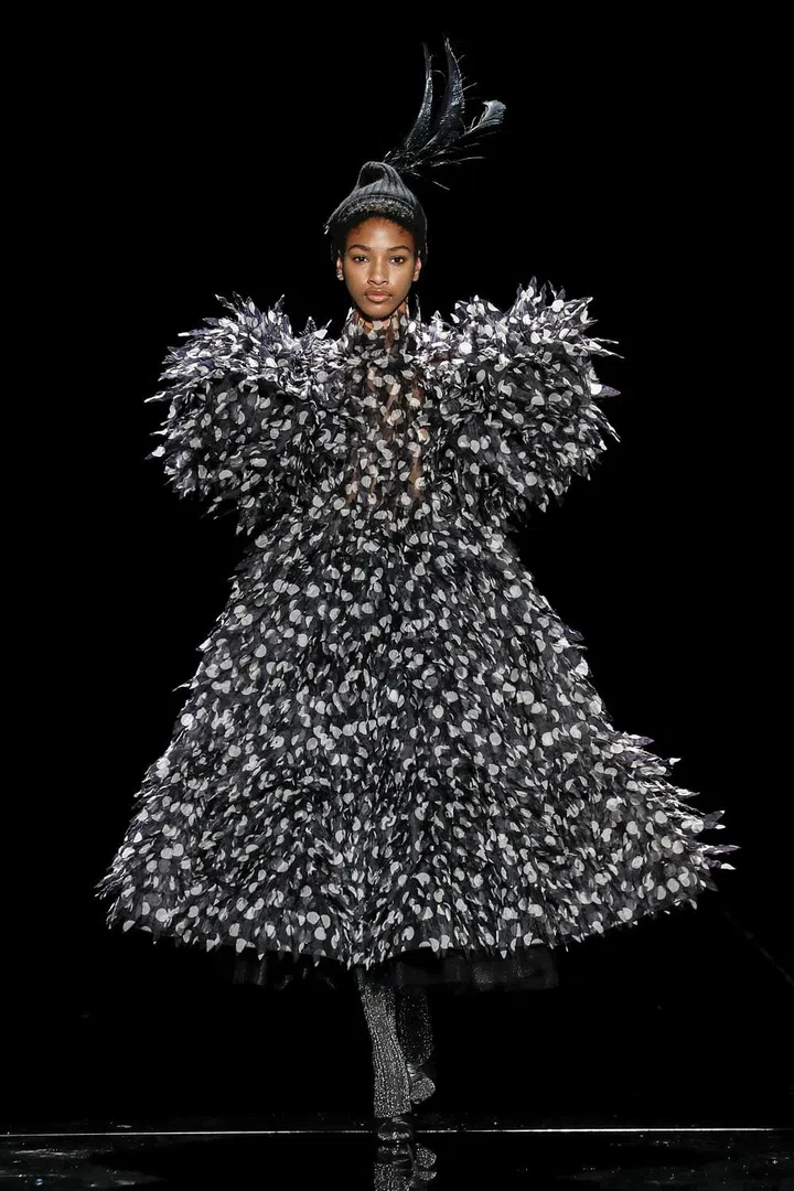 Marc Jacobs being Marc Jacobs (pictured here), delivered a show of maximalist proportions and volume where models bobbed up and down the runway in befeathered loofah-like dresses layered over crinoline.