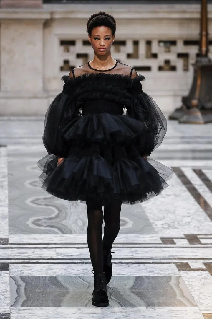 Embrace your dark side with romantic tulle and ruffles and bewitching sheer lace bodices at Molly Goddard (pictured here) and Preen by Thornton Bregazzi or go for a more “grown-up goth” look with a pared down double breasted jacket with ruched sleeves at Simone Rocha.