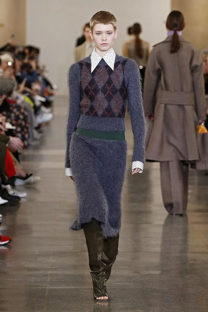 Victoria Beckham (pictured here) and Preen by Thornton Bregazzi favoured argyle – the diamond patterned knit once associated with grandpas but is now high-fashion. Alexa Chung, however, took the “nerd sweater” to a whole ‘nother level with not just one sweater, but five; all sheared up and patched together into a masterpiece.