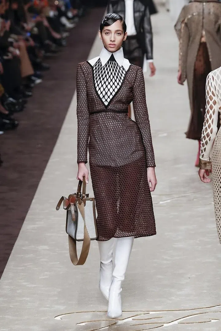 Whether it’s honeycomb mesh draped over a shirt at Fendi (pictured here), beaded sheer lace over orange trousers at Versace, or a web of hardcore-looking chains over nothing but a scarf at Marni, overlaying a mix of contrasting textures seem to be a recurring trend at Milan Fashion Week.