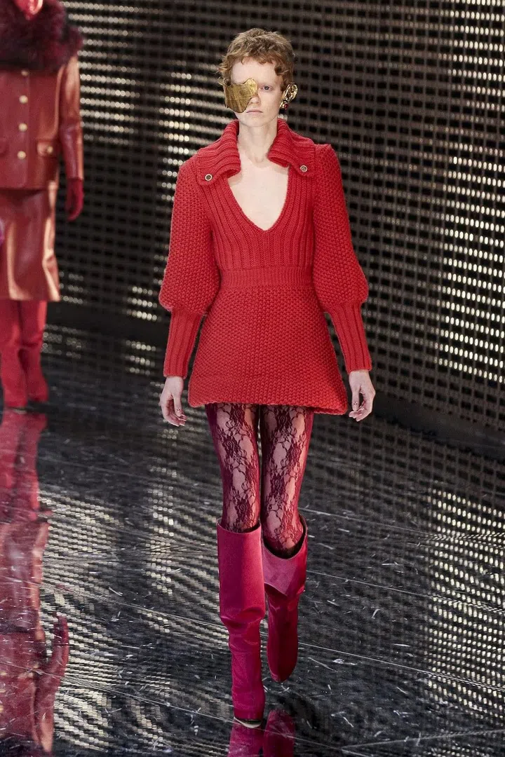 We’ve got knitted dresses that are cinched at the waist before extending out to a stiff flare and finished with balloon sleeves, courtesy of Gucci (pictured here) and Roberto Cavalli, and stoic black coats belted extra tight at the waist at Prada. Either way, Fall 2019’s silhouette will be wearing you, instead of the other way around.