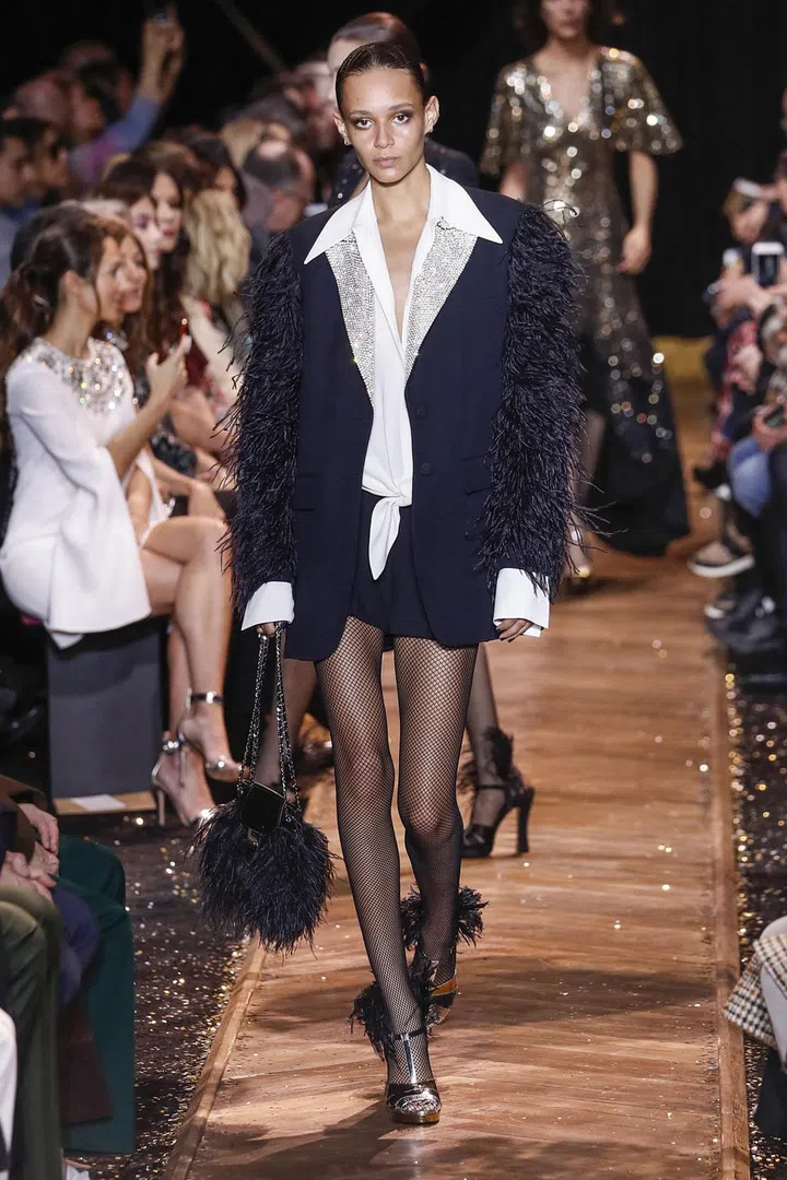 At Michael Kors (pictured here), oversized tuxedo blazers saw their sleeves replaced with trailing black plumes. Oscar de le Renta presented a lovely cocktail number with a cascading ruffled train sheathed in pristine white feathers.