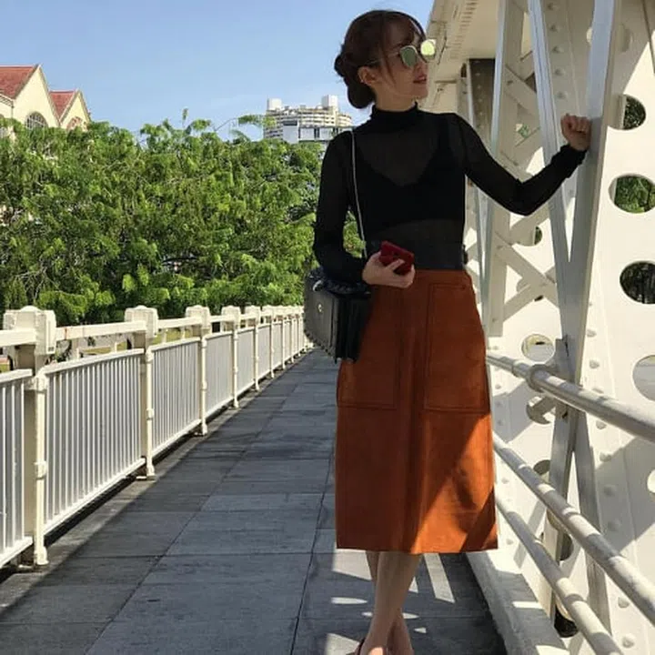 Apart from colour blocking and matching different prints, you can also mix various materials to elevate your look. Here, Fann wore a sheer ribbed pullover that showcased her inner black bralet, and juxtaposed the soft material with a sturdy, suede knee-length skirt.