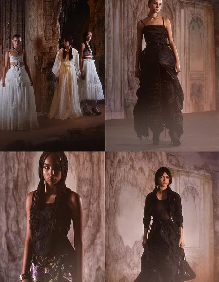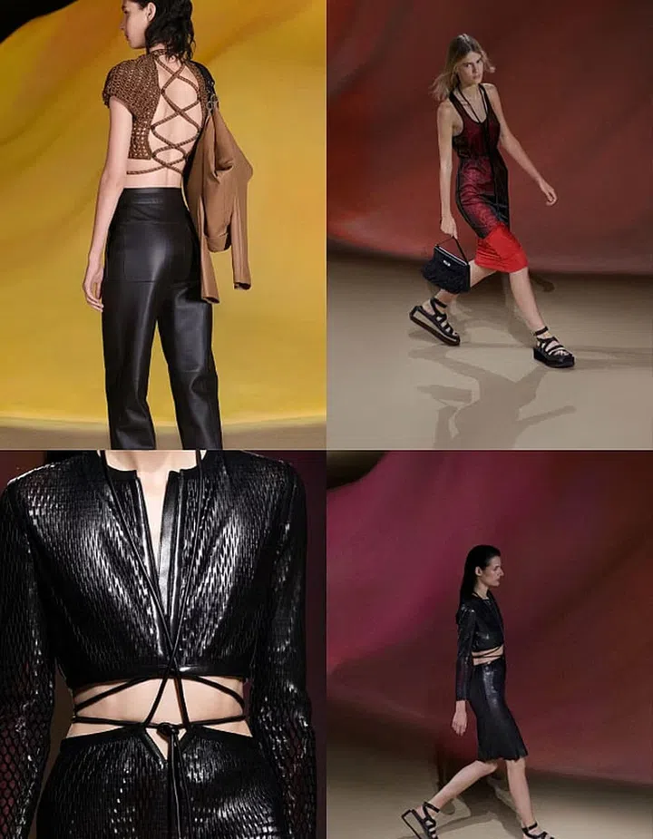 Nadege Vanhee-Cybulski of Hermes takes on desert rave wear this season and comes up with a festival-chic collection that’s distinctively the work of the French luxury maison. Coolly youthful numbers include a backless lace-up cropped top crafted from knotting ropes and perforated leather separates with strappy ties that Gen Z-ers would love. Coachella, are you ready?