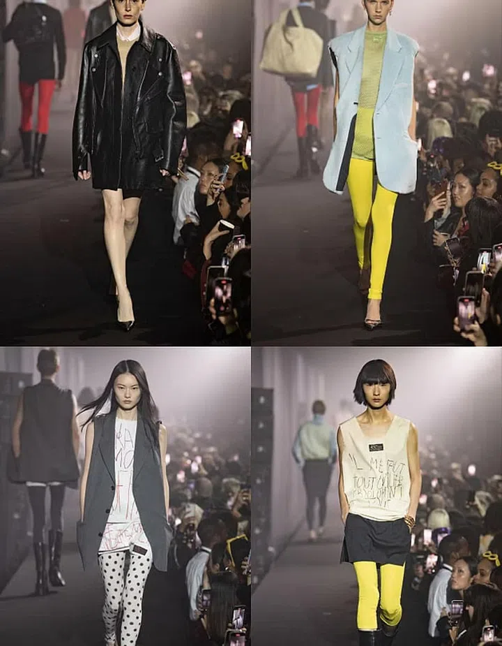For the swansong of his cult namesake label, Raf Simons had an underground, everybody’s-welcome rave party on his mind. So while he admits it to be his “barest, most minimal collection”, the entire affair is an artful confluence of multiple subcultural influences. First, there are his trademark techno strokes (cue the neon fishnet tank tops). At the same time, the echoes of New Wave (bright coloured tights) and classic punk (oversized biker jackets and graphic tees – this time printed with the frenetic text drawings of Belgian artist Philippe Vandenberg) are unmistakable.
