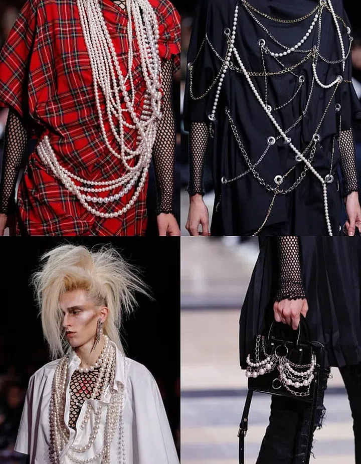 The Japanese designer Junya Watanabe is one of fashion’s most faithful punk devotees. For Spring Summer 2023 – his first collection to have been shown live in Paris since the pandemic – he’s brought out all its greatest tropes and then remixed them through a refined New Romantics lens. Fishnet tops, for example, are layered under ’80s-oversized, exquisitely deconstructed tailoring, while chains and pearls are worn generously not just as jewellery, but also all-over embellishments on tartan dresses. The effect: a gloriously defiant glamour.