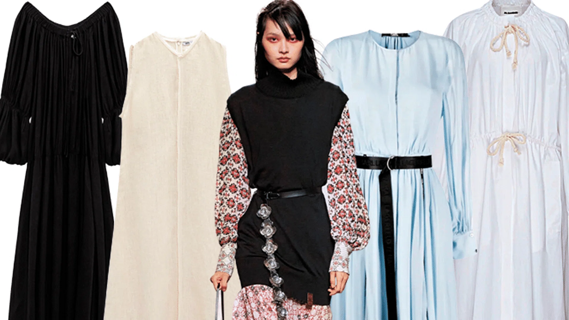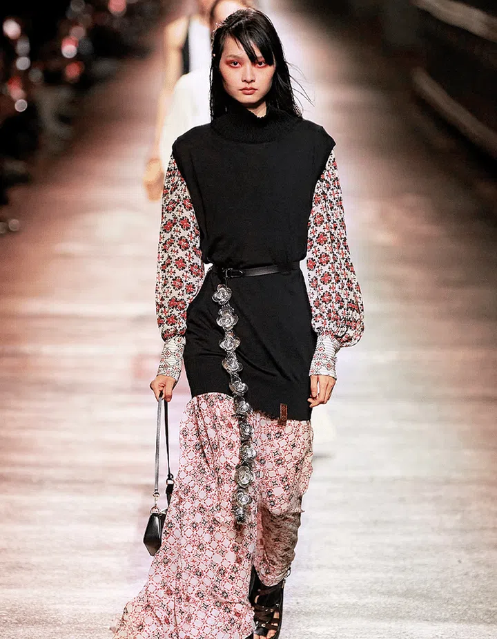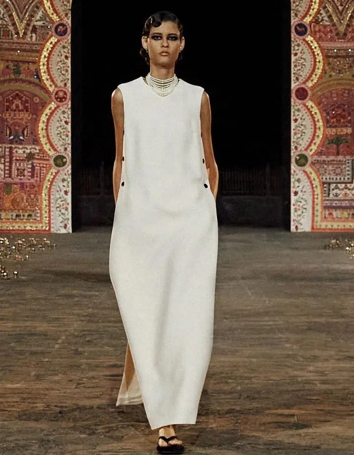 Some highlights includes, a simple sculptural white dress accessorised with a stunning cascading pearl choker at Dior. At Louis Vuitton’s Nicolas Ghesquiere adds a hint of androgyny to a flowing maxi dress by layering it with funnel- neck sleeveless sweater dresses and chunky sandals.