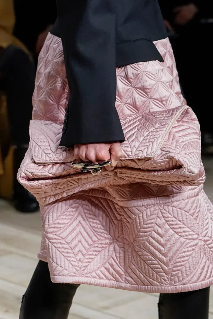 We remember thinking to ourselves, coming out from the FW ‘20 fashion month, that it would be a really cool idea to match our bags EXACTLY to our outfits. Alexander McQueen had a blush pink quilted foldover clutch teamed with a skirt crafted from the same fabric.