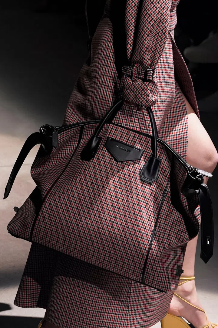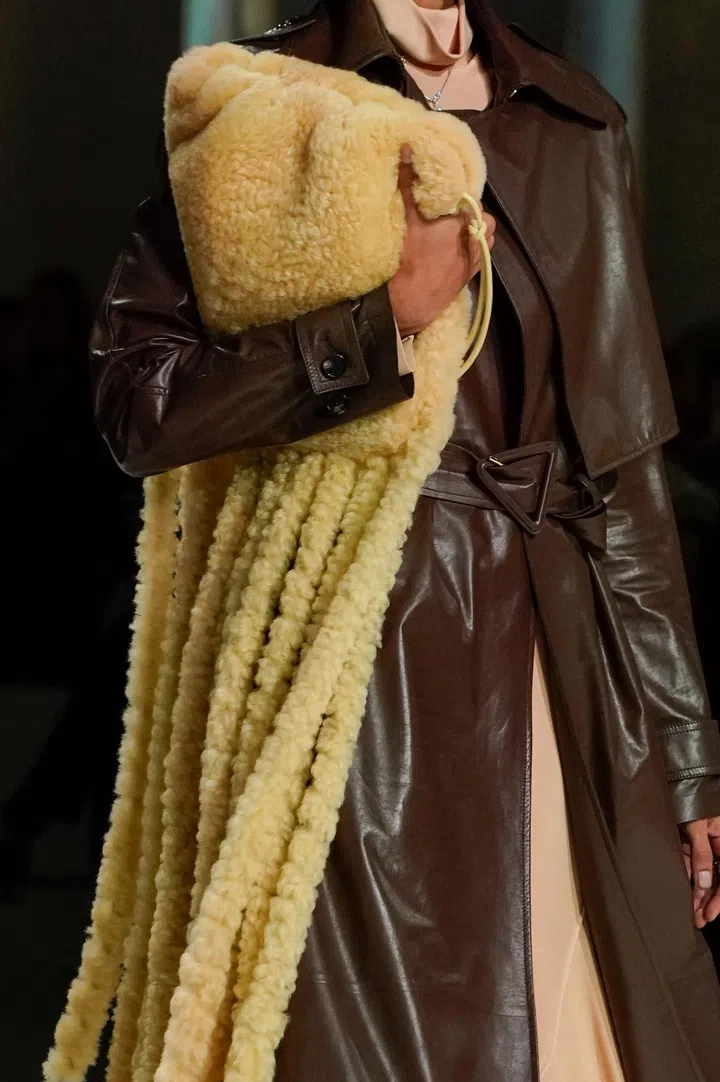 Fringing and tassels are a way for you to have fun with your bag styles this fall. Making rounds on the runway, seemingly handcrafted-with-love bags made from woven or knitted yarns are finished with loose trailing fringe embellishments. A pastel yellow clutch bag covered in soft fuzzy fur at Bottega Veneta stood out with a long curtain of thick fluffy lobs.