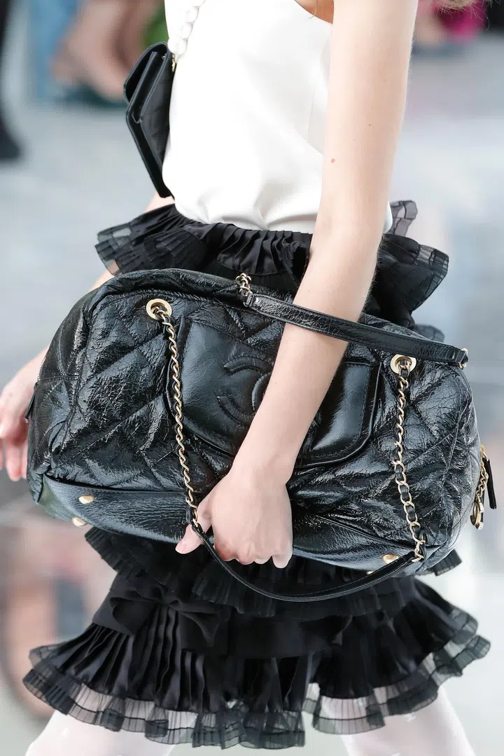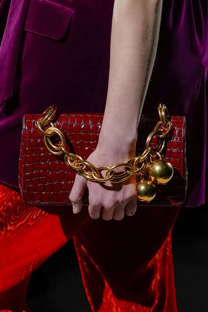 Dries Van Noten’s croc-embossed purses featured gold and silver chain straps decorated by massive ball bearings.