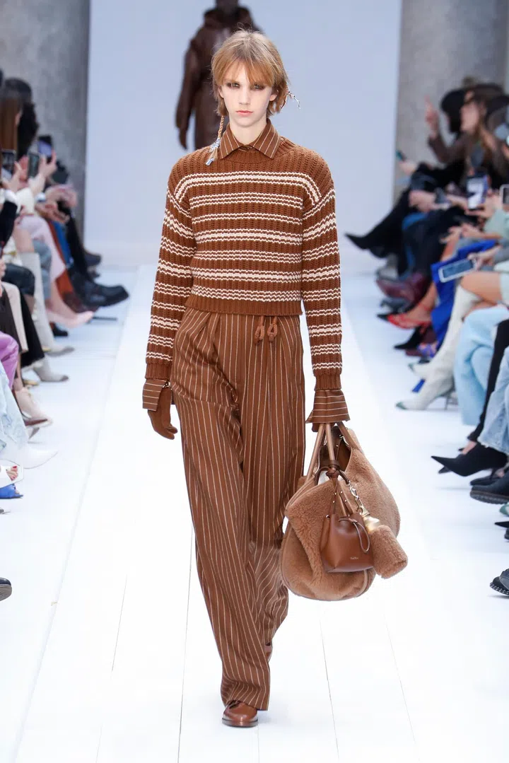 Max Mara’s furry brown receptacle had a smaller leather bucket bag and what looks to be a keychain of a metal water tumbler fitted with a sleeve tied to its strap.