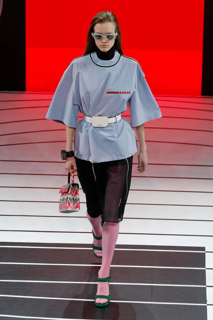 Prada had a collection of structured fold-over rectangular tote bags with a single stiff top handle, and they were all covered in different geometric prints.