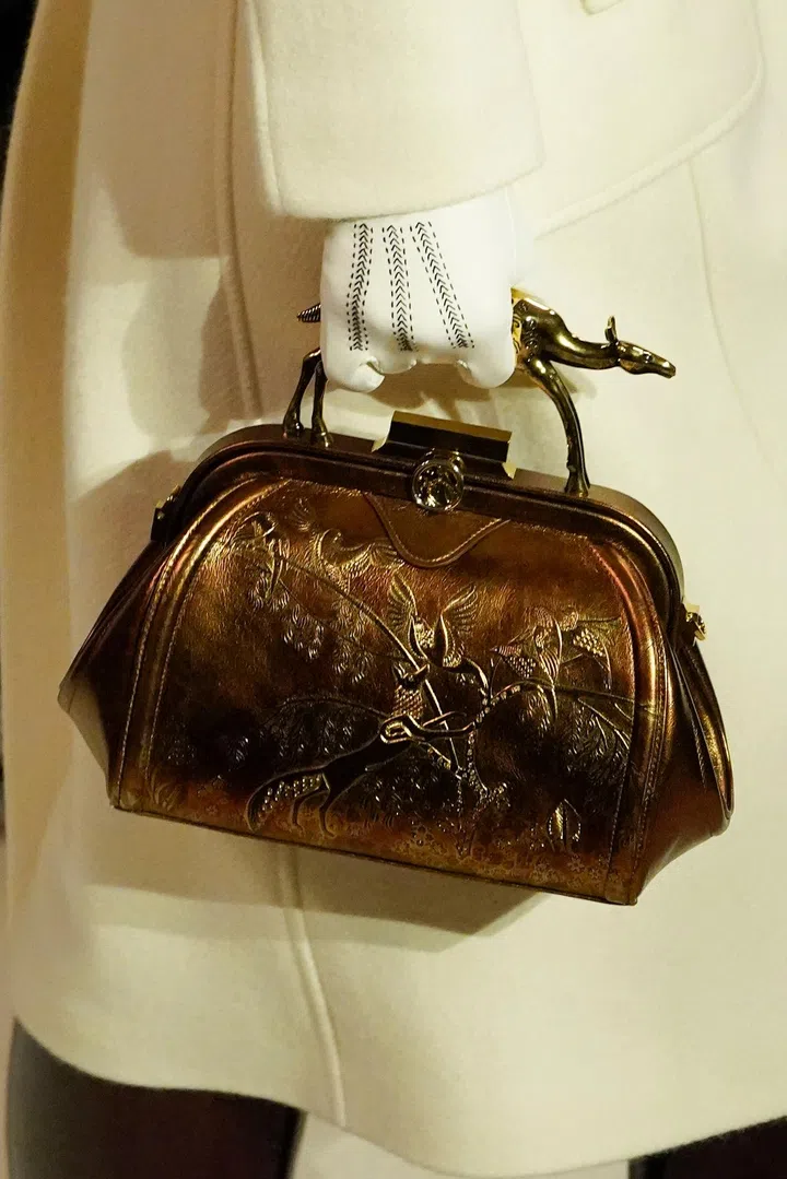 Lanvin had a regal structured purse that was coated in metallic bronze and featured exquisite embroidery.