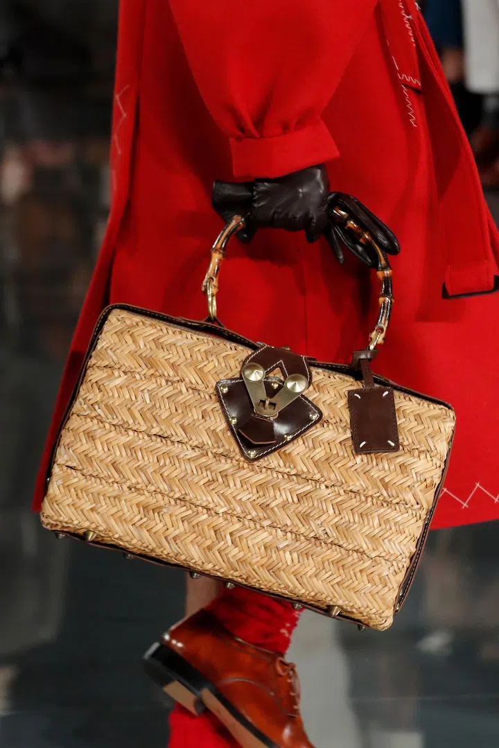 Maison Margiela opted for bamboo-like round handles that were fitted atop its woven raffia trunk bag.