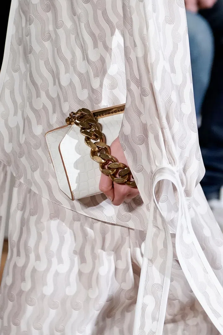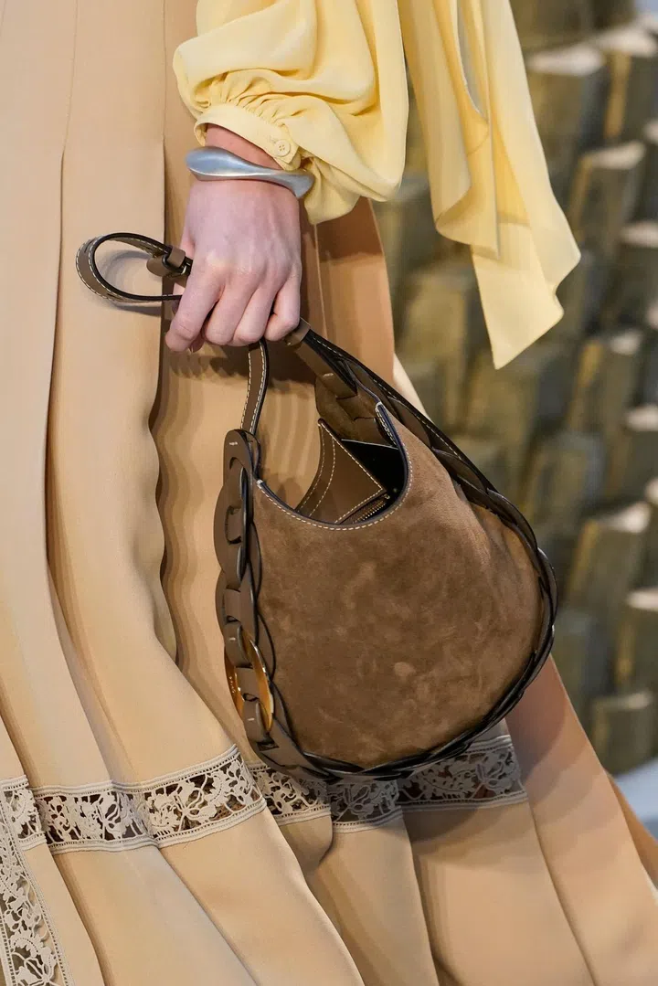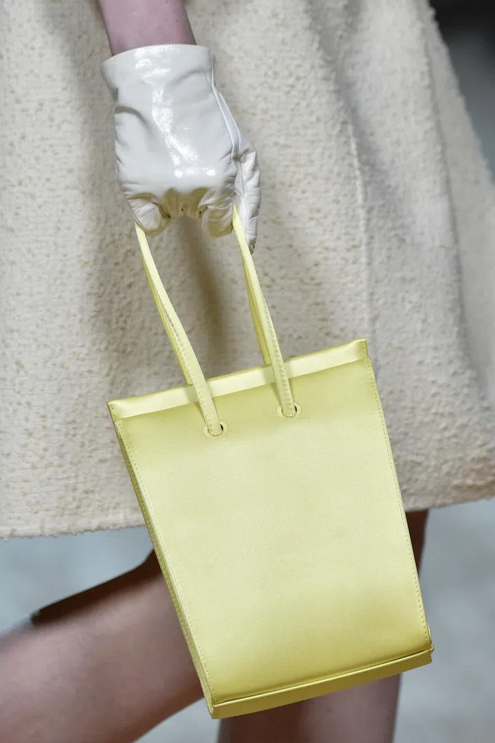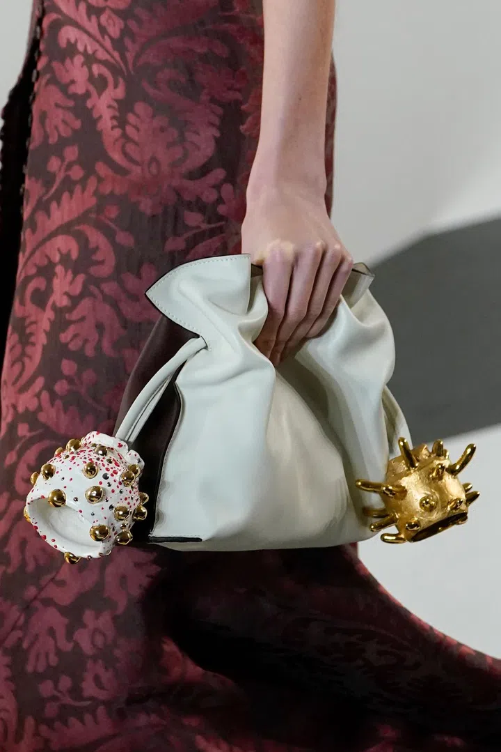Loewe had a collection of clutch bags in neutral coloured supple leather (think: white, brown and black) with sizeable gold-studded, conch shell-esque charms dangling from the end of the drawstrings.