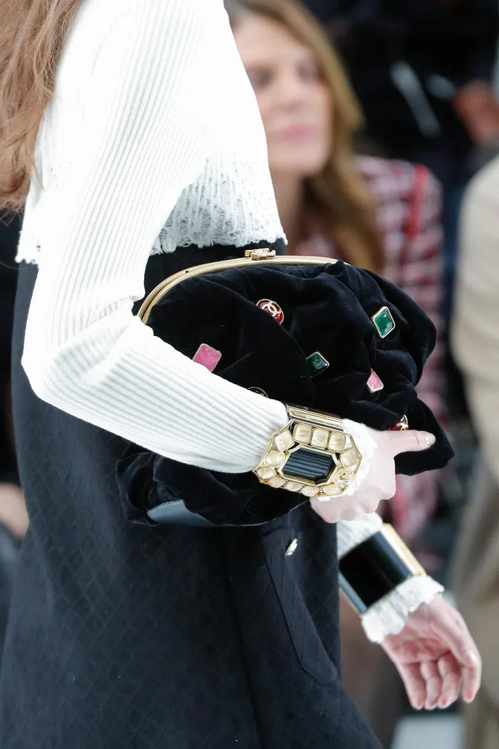 Representing the OTT lavishness that has gotten popular amongst the fashion crowd in recent seasons, designers are dressing their bags with statement embellishments and charms. At Chanel, oversized velvet clutch bags were festooned with saturated costume jewels that looked like they came straight out of grandma’s treasured jewellery trove.