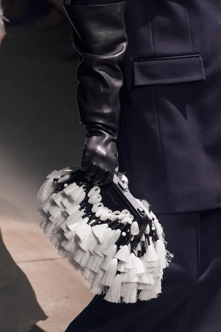 At Givenchy, a crowd of white tassels sprouted from a snap clasp clutch.
