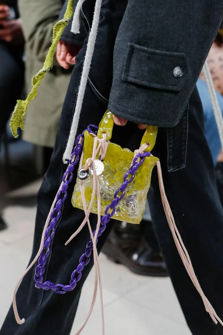 At Ottolinger, quirky jello-like totes in bright colours featured colour-contrasting toy-like plastic chains.