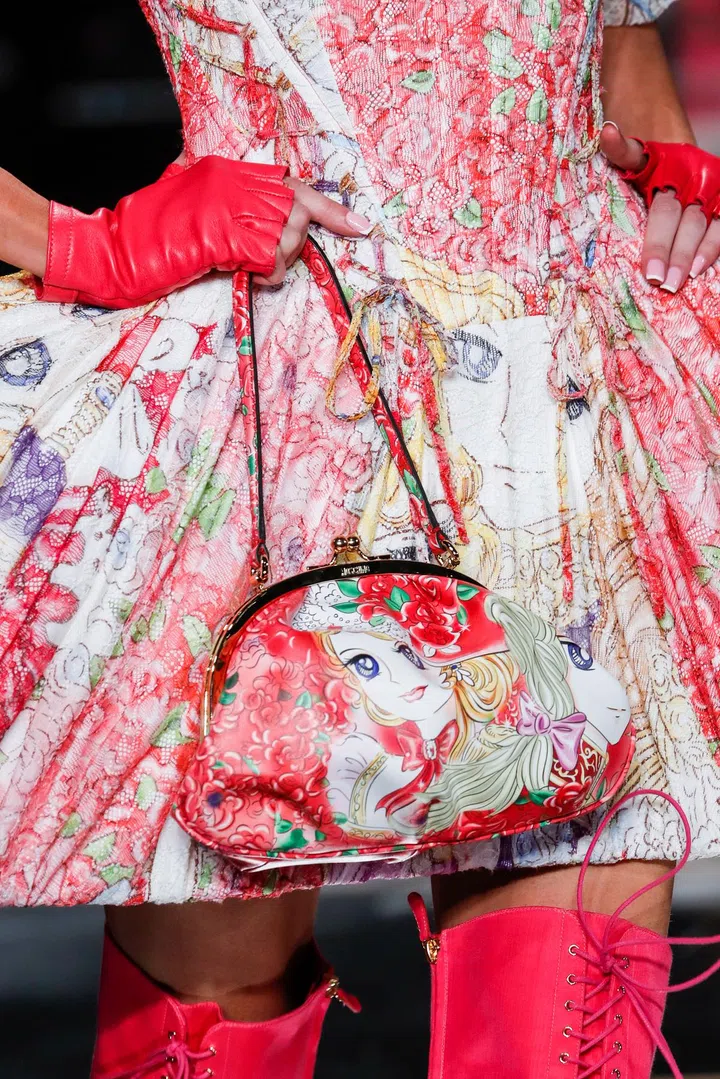 Moschino’s purses came with straps and covered in vibrant roses and an anime-style portrait of a lady.