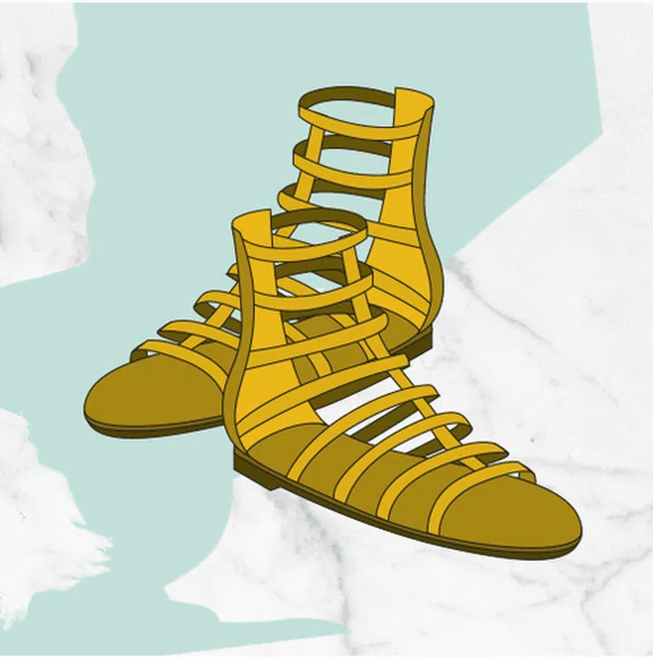 Definition: An open type of footwear where the sole is held to wearer’s foot by several straps. They are often closed heeled, and are inspired by the footwear of the Roman gladiators.